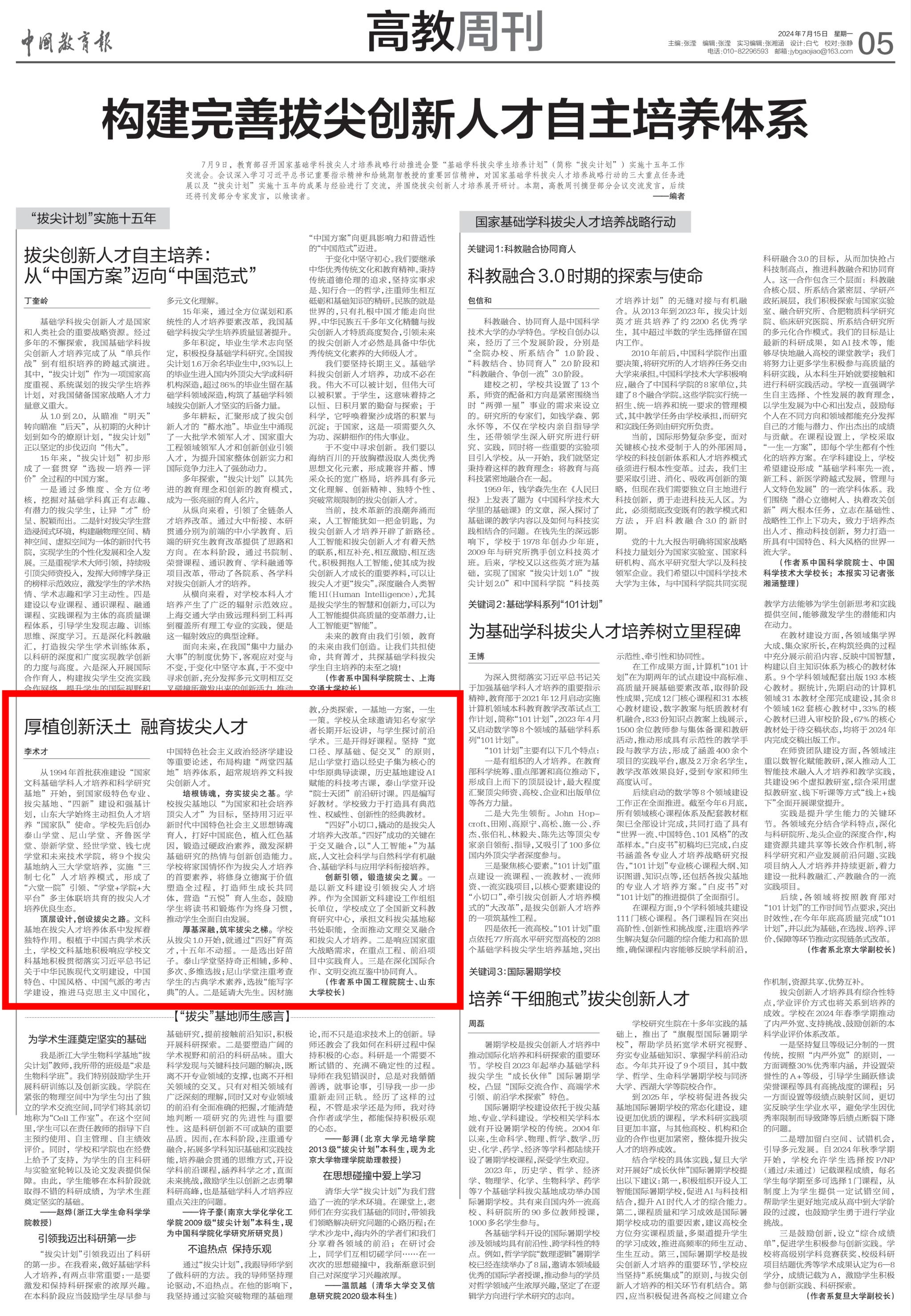 创新引领,锻造拔尖之翼。一是以新文科建设引领拔尖人才培养。作为全国新文科建设工作组组长单位,学校成立了全国新文科教育研究中心,承担文科拔尖基地秘书处职能,全面推动文理交叉融合和拔尖人才培养。二是响应国家重大战略需求,在重点工程、前沿项目中实践育人。三是在深化国际合作、文明交流互鉴中协同育人。
