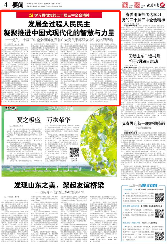 党的二十届三中全会胜利举行,审议通过的《中共中央关于进一步全面深化改革、推进中国式现代化的决定》(以下简称《决定》)覆盖推进中国式现代化方方面面,构筑了全景图,被人们称为“新时代新征程上推动全面深化改革向广度和深度进军的总动员、总部署”,“是指导新征程上进一步全面深化改革的纲领性文件”。《决定》将“聚焦发展全过程人民民主”列为“七个聚焦”之一并作出战略部署,引发我省党员干部群众热议。