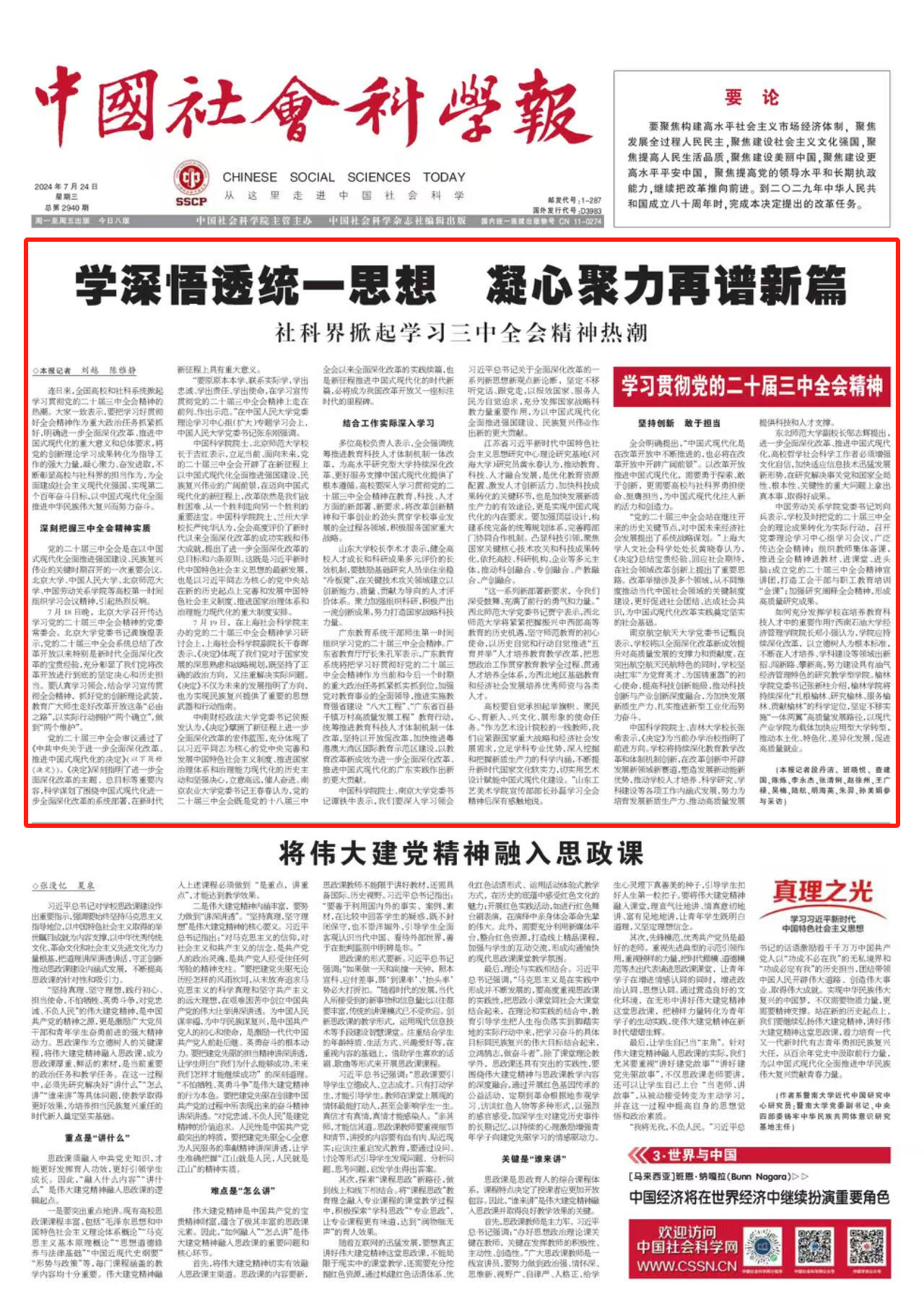 连日来,全国高校和社科系统掀起学习贯彻党的二十届三中全会精神的热潮。大家一致表示,要把学习好贯彻好全会精神作为重大政治任务抓紧抓好,明确进一步全面深化改革、推进中国式现代化的重大意义和总体要求,将党的创新理论学习成果转化为指导工作的强大力量,凝心聚力、奋发进取,不断彰显高校与社科界的担当作为,为全面建成社会主义现代化强国、实现第二个百年奋斗目标,以中国式现代化全面推进中华民族伟大复兴而努力奋斗。