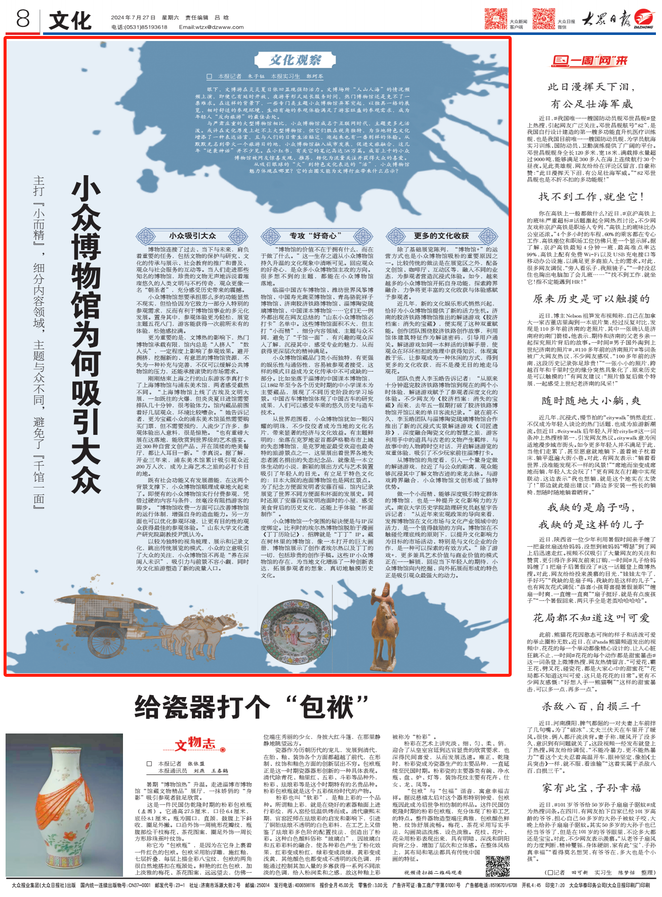 临淄中国古车博物馆、潍坊世界风筝博物馆、中国寿光蔬菜博物馆、青岛骆驼祥子博物馆、济南胶济铁路博物馆、淄博陶瓷琉璃博物馆、中国课本博物馆……它们无一例外都出现在网友总结的“山东小众博物馆必打卡”名单中。这些博物馆面积不大,但主打“小而精”,细分内容领域,主题与众不同,避免了“千馆一面”,有兴趣的观众深入了解,沉浸其中,感受专业的魅力,从而获得更深层次的精神满足。