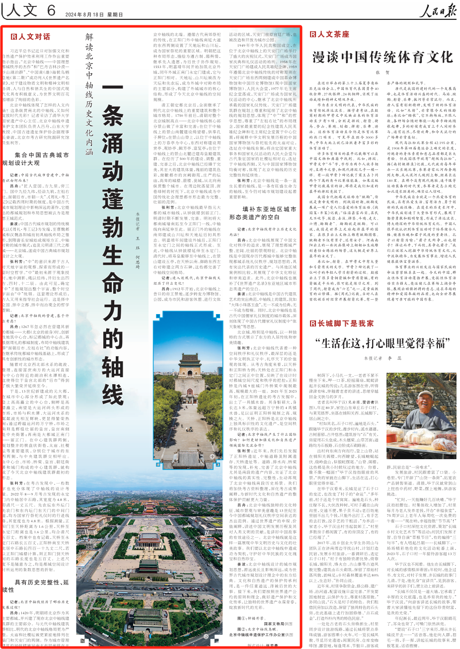 北京中轴线体现了怎样的人文内涵?这条纵贯南北的中轴线,又如何绽放时代光彩?记者采访了清华大学国家遗产中心主任、北京中轴线申遗保护文本团队负责人吕舟,山东大学教授、中国古迹遗址保护协会副理事长姜波,北京市考古研究院副研究馆员张利芳。