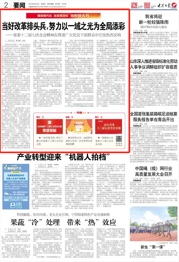 将“排头兵”打造成新征程上山东改革最显著的标识、最有力的指引,全省上下坚定扛牢“走在前、挑大梁”的使命担当,锐意进取、积极作为,改革创新、攻坚克难,努力以一域之光为全局添彩。翻看《意见(讨论稿)》,青岛大学党委书记胡金焱感受最深的是,文件通篇贯彻党的二十届三中全会精神,全面承接中央部署的改革任务,并结合山东实际制定细化举措。“《意见》改革味浓、成色足,充分体现了山东在进一步全面深化改革上当好排头兵的信心决心。”胡金焱说。