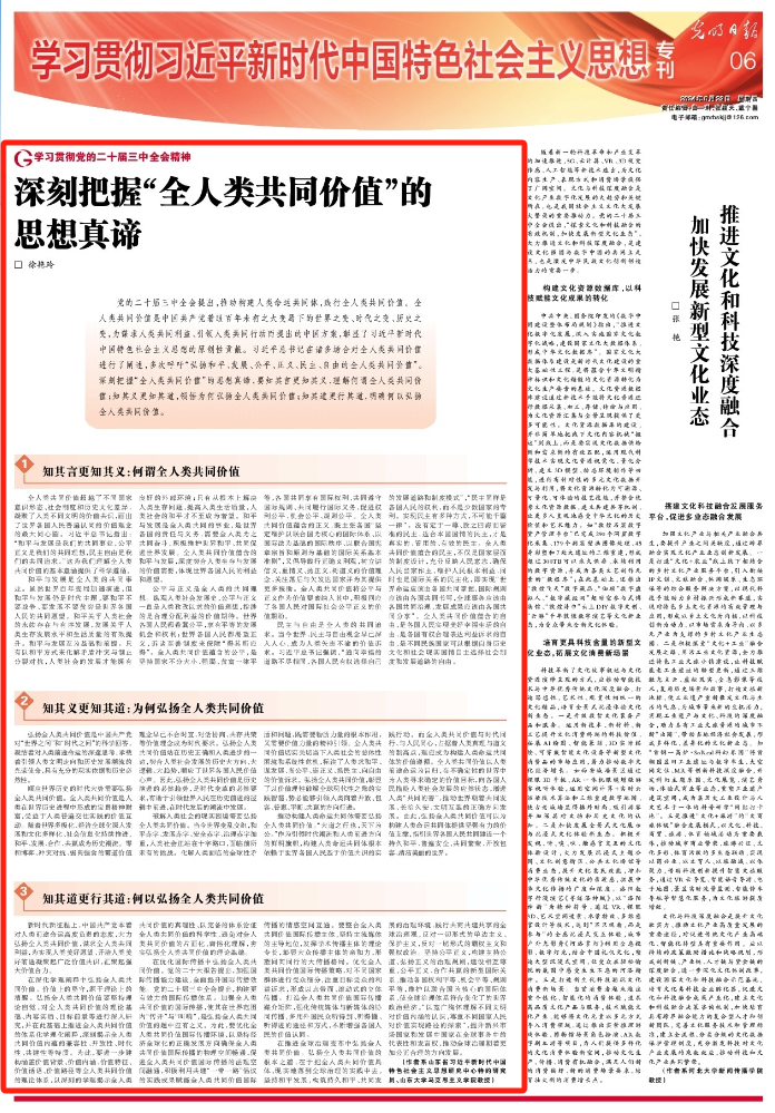 弘扬全人类共同价值是中国共产党对“世界之问”和“时代之问”的科学回答,凝结着对人类前途命运的深邃思考,承载着引领人类文明走向和历史发展潮流的光荣使命,具有充分的现实依据和历史必然性。