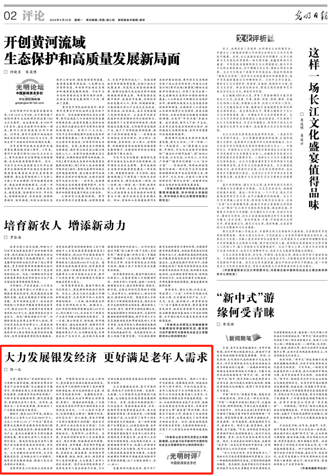 据统计,截至2023年年底,我国60周岁及以上老年人口已达29697万人,占总人口的21.1%。《“十四五”国家老龄事业发展和养老服务体系规划》提出,大力发展银发经济,推动老龄事业与产业、基本公共服务与多样化服务协调发展,努力满足老年人多层次多样化需求。银发经济涵盖为老年人提供产品与服务的各类经济活动,涉及面广、产业链长、业态多元、潜力巨大。立足老龄社会治理实际,大力发展银发经济,是积极应对人口老龄化、培育经济发展新动能、提高人民生活品质的必然要求。