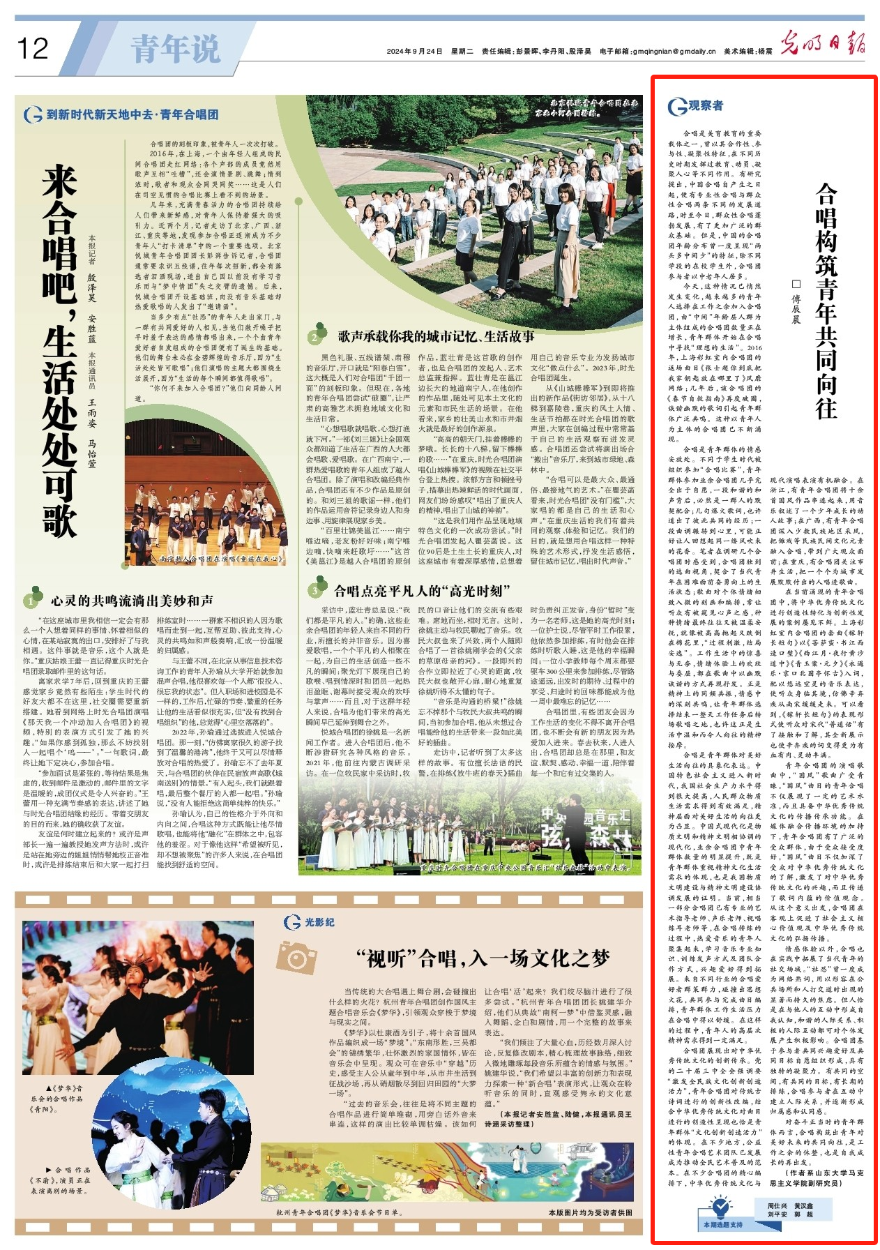 合唱团展现出对中华优秀传统文化的创新传承。党的二十届三中全会强调要“激发全民族文化创新创造活力”,青年合唱团对传统古诗词进行的创新性改编,结合中华优秀传统文化对曲目进行的创造性呈现也恰是青年群体“文化创新创造活力”的体现。在不少地方,公益性青年合唱艺术团队已发展成为推动全民艺术普及的范本。在不少合唱团的精心编排下,中华优秀传统文化与现代演唱表演有机融合。在浙江,有青年合唱团将十余首国风作品串连起来,用音乐叙述了一个少年成长的动人故事;在广西,有青年合唱团深入少数民族地区采风,把傩戏等民族民间文化元素融入合唱,带到广大观众面前;在重庆,有合唱团关注市井生活,把一个个为城市发展默默付出的人唱进歌曲。