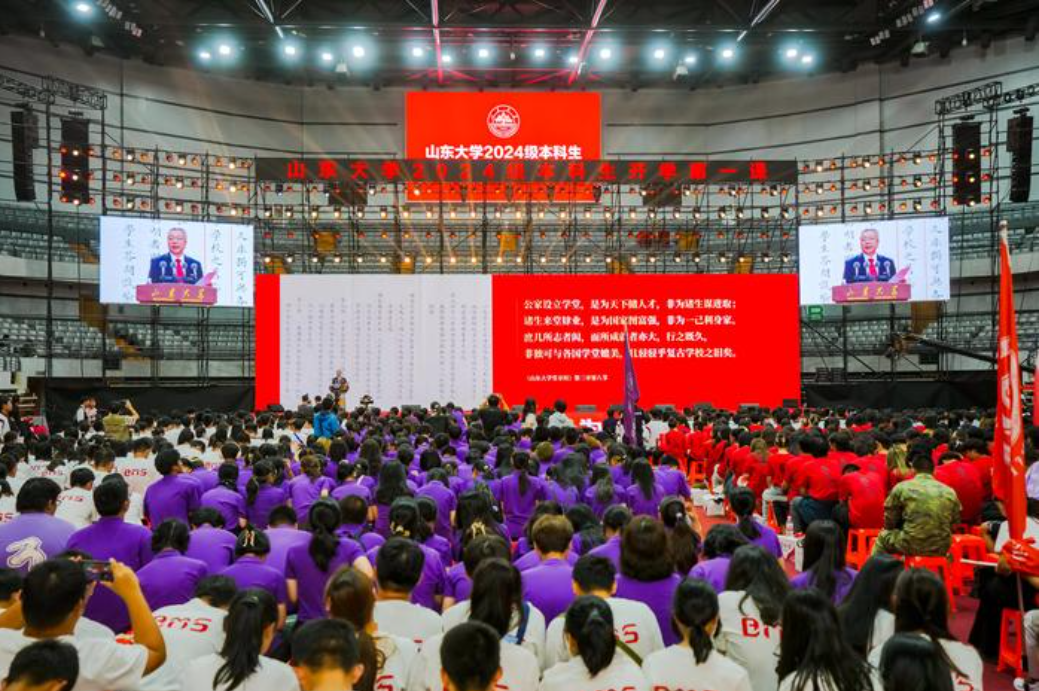 9月20日晚6点,山东大学2024级本科生开学典礼在济南、青岛、威海校区同时进行,并通过视频直播连线互通,这也是该校开学典礼首次在一校三地校区同时上演,万余名本科新生跨越山海共上一堂课。中国工程院院士、校长李术才在致辞中寄语新生,要提升学习、创造、思辨、坚韧、沟通、领导6种能力,学校将为学生厚植成才沃土,为大家实现青春报国梦想插上腾飞的翅膀。