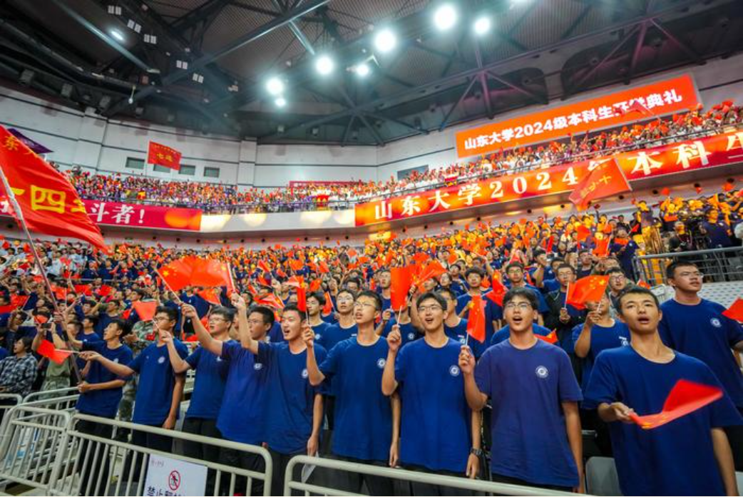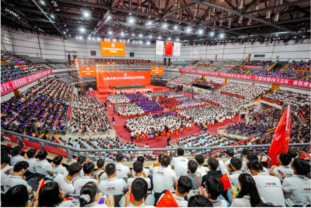 山东大学2024级本科生开学典礼主会场在该校中心校区体育馆开启,该校党委书记任友群为4名新生代表赠送《山东大学章程》;校长助理、青岛校区党工委书记邢占军,威海校区党工委书记仇道滨分别在所在校区为新生代表赠送《山东大学章程》。李术才在主会场为1名新生代表佩戴校徽,常务副校长吴臻、副校长刘建亚则分别在青岛校区、威海校区为新生代表佩戴校徽,全场其他新生也为自己戴上校徽。