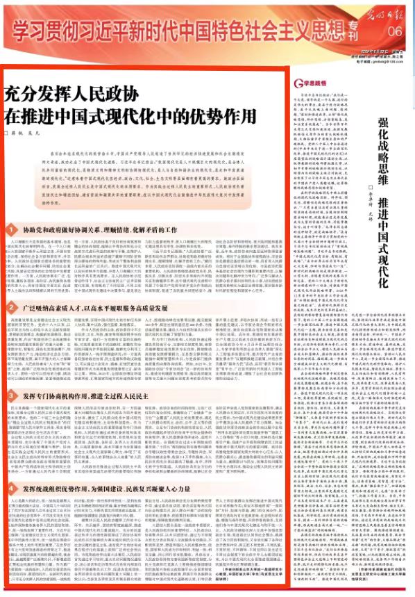 在百余年追求现代化的艰苦奋斗中,中国共产党领导人民创造了世所罕见的经济快速发展和社会长期稳定两大奇迹,成功走出了中国式现代化道路。习近平总书记指出:“我国现代化是人口规模巨大的现代化,是全体人民共同富裕的现代化,是物质文明和精神文明相协调的现代化,是人与自然和谐共生的现代化,是走和平发展道路的现代化。”这意味着中国式现代化在经济、政治、文化、社会、生态文明等层面都有着更高的要求。就政治层面而言,发展全过程人民民主是中国式现代化的本质要求。作为实践全过程人民民主的重要形式,人民政协肩负着发扬民主和增进团结、建言资政和凝聚共识的重要职责,在以中国式现代化全面推进中华民族伟大复兴中发挥着独特作用。