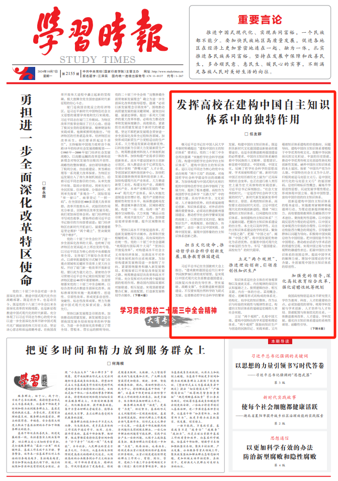 继习近平总书记在中国人民大学考察时明确提出“建构中国自主的知识体系”要求后,党的二十届三中全会再次强调“实施哲学社会科学创新工程,构建中国哲学社会科学自主知识体系”。建构中国自主的知识体系,是以习近平同志为核心的党中央站在统筹“两个大局”的高度,对我国哲学社会科学建设作出的战略部署,为加快构建与中国式现代化相匹配的中国特色哲学社会科学指明了发展方向、提供了根本遵循。高校作为我国哲学社会科学“五路大军”中的重要力量,具有学科齐全、文化积淀、人才储备的优势,肩负着基础理论创新、知识体系建设、对外话语传播的重要使命,必须站在推进教育强国建设、推动哲学社会科学繁荣发展的高度上,以坚定的文化自觉,聚焦知识生产、统筹规划、协同配合、传播推广,走出一条立足中国实践、诠释中国发展、展现中国形象的自主知识体系创新之路。