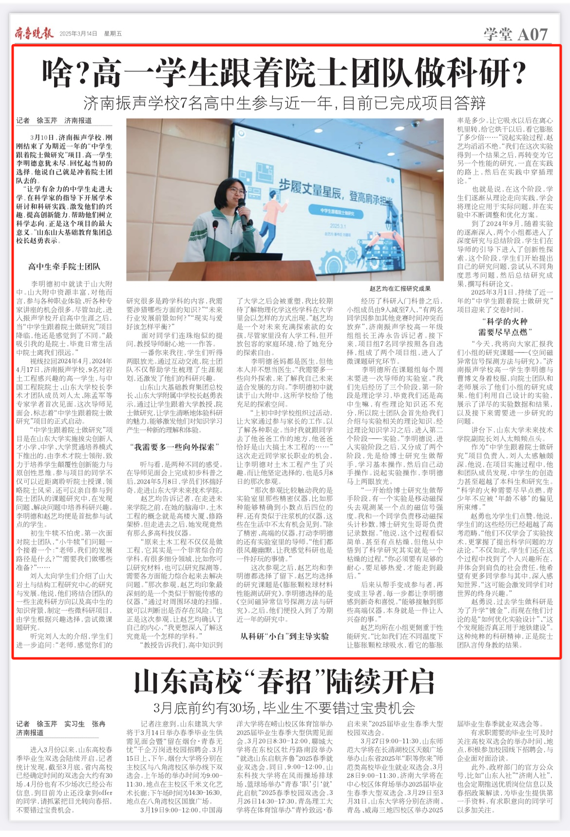 3月10日,济南振声学校,刚刚结束了为期近一年的“中学生跟着院士做研究”项目的高一学生李明德意犹未尽。回忆起当初的选择,他说自己就是冲着院士团队去的。