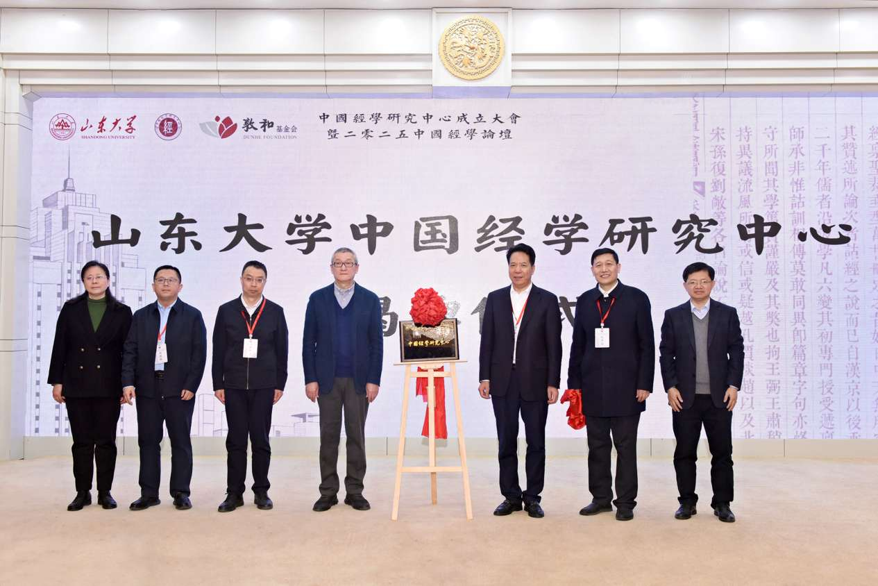山东大学人文社科研究院副院长刘祖国在会上宣读了《关于成立山东大学中国经学研究中心的通知》。山东大学副校长曹现强、浙江敦和慈善基金会理事康晓光、山东大学文学院党委书记郭春晓、院长黄发有、山东大学中国经学研究中心主任杜泽逊、山东大学合作发展部副部长常世旺、刘祖国共同为山东大学中国经学研究中心揭牌。