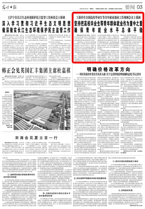 丁薛祥指出,高校毕业生是党和国家宝贵的人才资源,高校毕业生等青年就业创业工作关系千家万户。要深入学习贯彻习近平总书记重要指示精神,贯彻落实党中央和国务院决策部署,坚持把高校毕业生等青年群体就业作为重中之重,确保青年就业水平总体平稳。