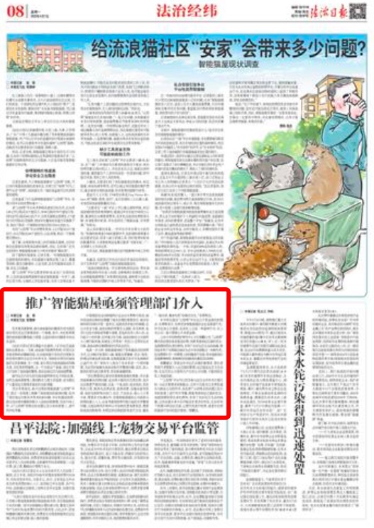 “因此需要辩证看待安装智能猫屋的现象。平台虽然能够解决投喂问题,但如果不能同步负责后续,也许会出现更严重的问题。这是一个复杂的、综合性的、系统性的工程,既涉及法律法规、政策制度、设施设备等层面,也涉及政府相关部门、社区、行业协会、爱心人士等主体,需要多方协调合作。安装智能猫屋的公司或参与投喂的爱心人士,应该考虑到投喂可能引起的无序繁殖问题。当地动物保护组织从对动物负责角度来讲,需要给流浪动物绝育,和附近的动物医院等进行互动,避免‘一猫生病、集体吃药’的情况发生。”宋厚辉说。
