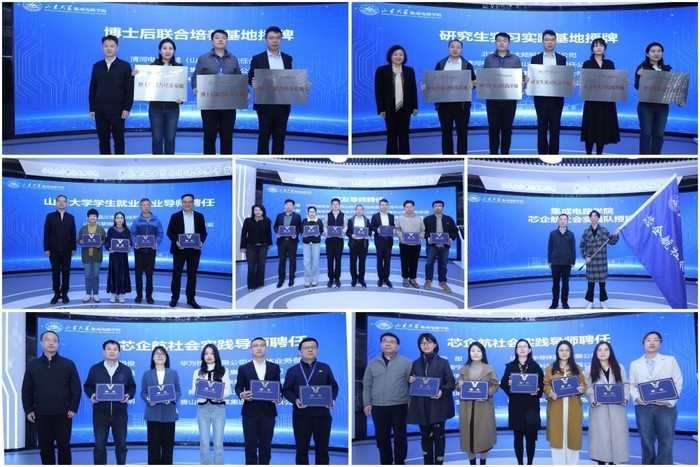 会上还为研究生实习实践基地、博士后联合培养基地授牌,为山东大学就业创业导师、山东大学校友导师、芯企航社会实践导师颁发聘任证书,为山东大学集成电路学院芯启航社会实践团队授旗。集成电路学院相关负责人分享学科建设、产教融合育人实践以及未来合作倡议。