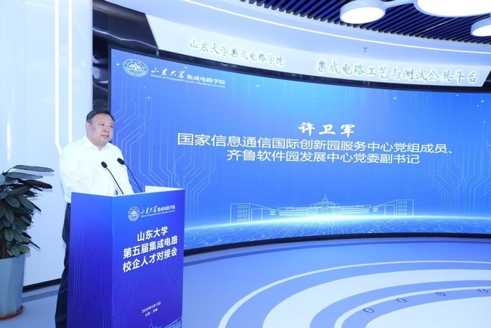 许卫军回顾了济南市高新区、齐鲁软件园和山东大学联合共建集成电路学院的成果。他表示将持续深化校地企战略合作,推进产学研深度融合,积极探索共建共创共享的合作模式,搭建产业科技发展与高校人才培养的精准桥梁,实现三方互利共赢、协同发展。