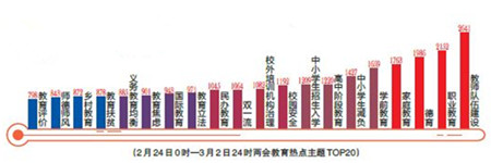 2021年全国两会开幕在即,教育话题快速“升温”。中国教育报刊社数据中心对两会前一周的教育热点和舆情进行了监测分析。数据显示,2月24日—3月2日与两会教育相关的网络文章共计100536篇/条。从热点主题分布来看,教师队伍建设、职业教育、德育、家庭教育等位居榜单前列。受“中央一号文件”发布影响,教育扶贫、乡村教育等主题热度上升。