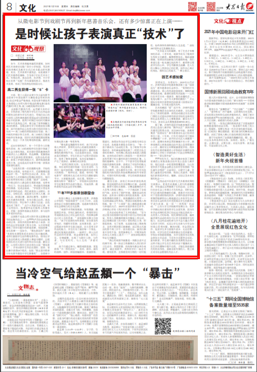 如今,艺术美育越来越受到重视。如何把艺术美育切实推广到中小学校园,用怎样的培养模式及教学方式已成为重点研究课题。其实,艺术美育不重技法,而是重孩子们艺术修养的锤炼,引导孩子们以艺术为工具,发现自我、表达自我。在济南,不少学校正在将“实践”作为重要的抓手,推进艺术美育,形成了别具特色的校园文化。