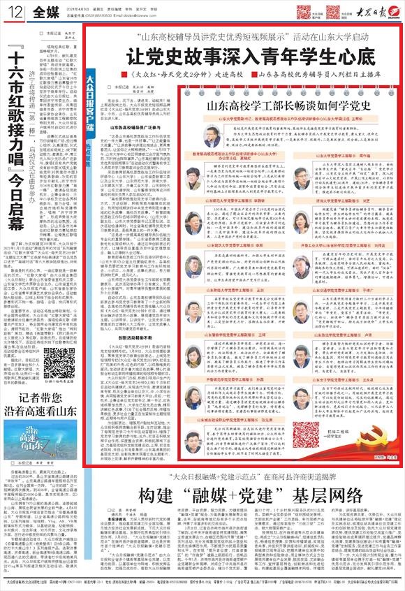 启动仪式后,山东各高校辅导员队伍创新表达参与党史学习教育有了一个全新的阵地,各高校优秀辅导员将实质性融入大众日报《大众红·每天党史2分钟》栏目,通过精彩出镜讲述党史小故事,展现建党百年宏大主题。以讲带学,以讲促干,让党史学习教育落实到立德树人大工程中,让党史故事入脑入心,共同为建党百年献礼。