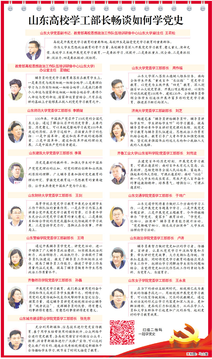 教育部高校思政工作队伍培训研修中心(山东大学)办公室主任夏晓虹表示,各高校辅导员要把党史学习教育与工作实际相结合,小切口、小角度、故事化表达,努力做到润物无声,成风化人。