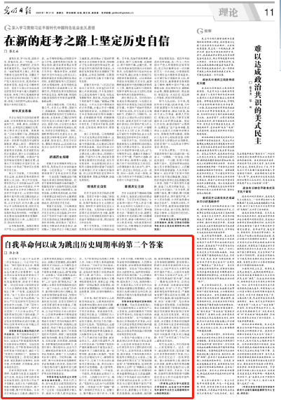 在党的十九届六中全会第二次全体会议上,习近平总书记指出:“我们党历史这么长、规模这么大、执政这么久,如何跳出治乱兴衰的历史周期率?毛泽东同志在延安的窑洞里给出了第一个答案,这就是‘只有让人民来监督政府,政府才不敢松懈’。经过百年奋斗特别是党的十八大以来新的实践,我们党又给出了第二个答案,这就是自我革命。”在十九届中央纪委六次全会上,习近平总书记强调,“全面从严治党是新时代党的自我革命的伟大实践,开辟了百年大党自我革命的新境界”。科学认识党的十八大以来全面从严治党取得的历史性开创性成就、产生的全方位深层次影响,必须立足党的自我革命的成功实践,诠释好自我革命何以成为跳出历史周期率的第二个答案。