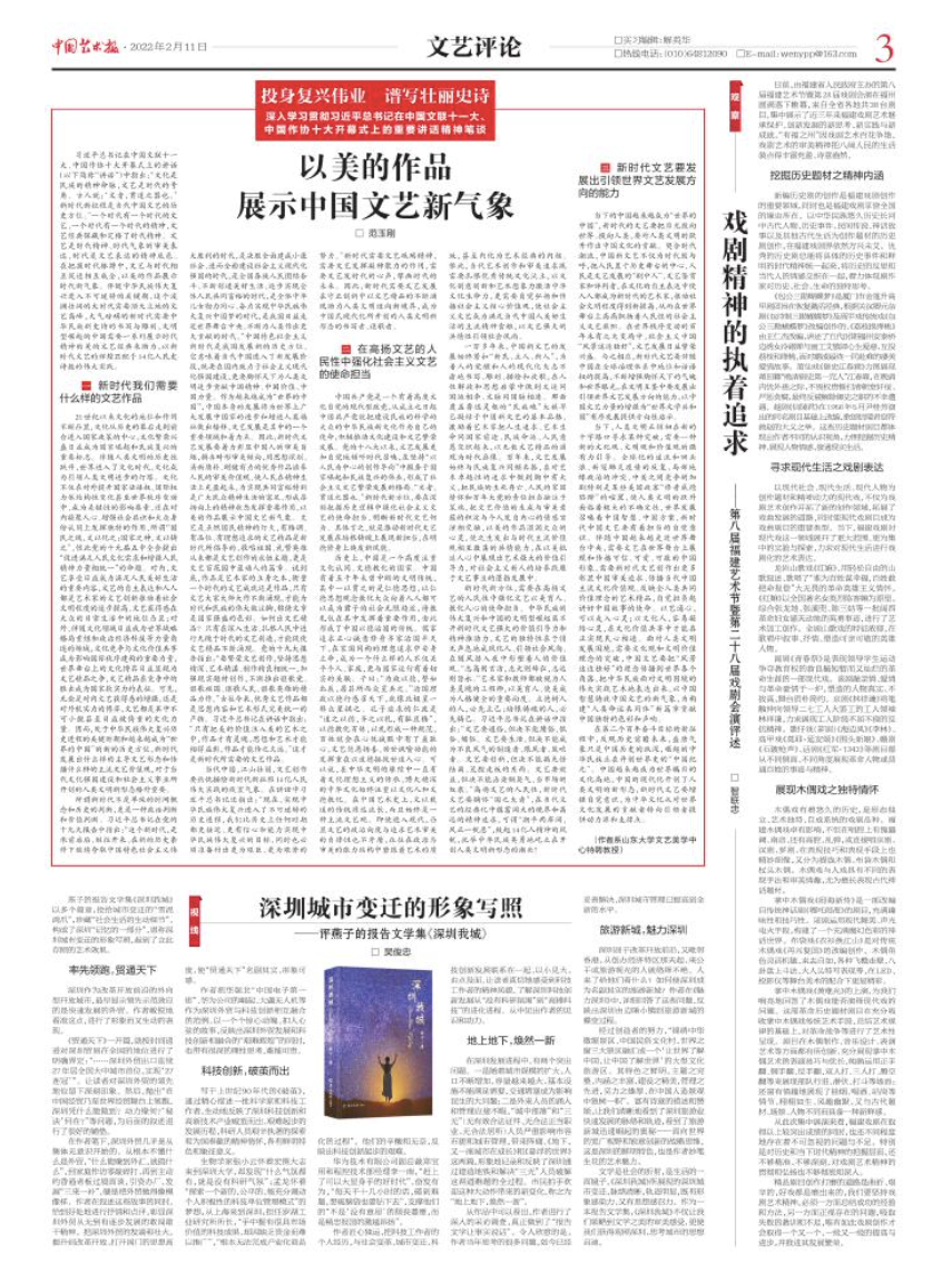 习近平总书记在中国文联十一大、中国作协十大开幕式上的讲话(以下简称“讲话”)中指出:“文化是民族的精神命脉,文艺是时代的号角。古人说:‘文者,贯道之器也。’新时代新征程是当代中国文艺的历史方位。”一个时代有一个时代的文艺,一个时代有一个时代的精神,文艺经典保藏和定格了时代精神。文艺是时代精神、时代气象的审美表达,时代是文艺表达的精神底色。在把握时代脉搏中,文艺与时代相互促进相互成全,以美的作品展示时代新气象。伴随中华民族伟大复兴进入不可逆转的关键期,这个波澜壮阔的大时代需要顶天立地的文艺高峰,大气磅礴的新时代需要中华民族新史诗的书写与雕刻,文明型崛起的中国需要一系列展示时代精神的美的文艺经典来助力,以新时代文艺的辉煌匹配于14亿人民史诗般的伟大实践。