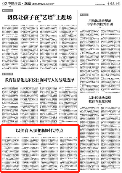 培养昂扬向上的价值观、健康的审美观,是一项关乎未来的基础性工程。中共中央办公厅、国务院办公厅曾发布《关于全面加强和改进新时代学校美育工作的意见》,学校需要反复领会其中的精神,并认真落实,发挥好在培养学生正确审美观中的主阵地作用。