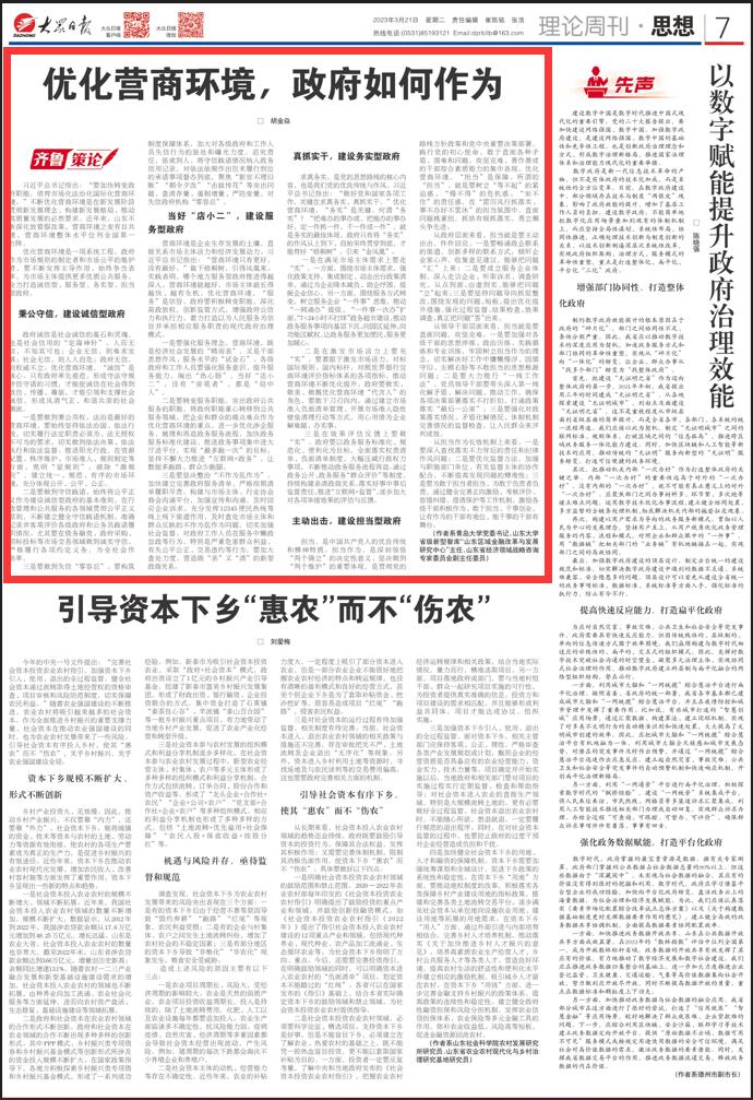 习近平总书记指出:“要加快转变政府职能,培育市场化法治化国际化营商环境。”不断优化营商环境是在新发展阶段贯彻新发展理念、构建新发展格局、推动高质量发展的必然要求。近年来,山东不断深化放管服改革,营商环境之变有目共睹,营商环境整体水平位列全国第一方阵。