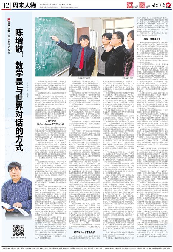 “可以尝试用现代金融产品的方式,解决民生问题。”陈增敬的这种社会责任感,让他建立起数学与现实世界之间一种自洽的联系。让数学助力科技发展,服务国家重大需求正是担任全国政协委员的陈增敬近几年来参政议政、建言献策的主要话题。