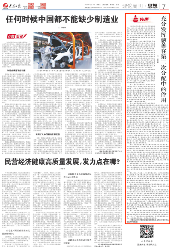 人们普遍认为,初次分配是市场调节,按照生产要素贡献进行分配,注重效率,对分配结果产生最为基础的作用,但初次分配容易形成贫富分化;再分配是政府调节,按照公平优先的原则,通过税收、社会保障和补助等,保障基本公共服务均等化,着重缓解收入分配差距;第三次分配则受道德、文化传统驱动,通过社会互助和自愿捐赠等形式扶贫济困,是多层次社会保障体系的补充。慈善是第三次分配的主要方式,是自愿的、无偿的和利他的,不是强制摊派,不是劫富济贫,也不是先富群体的法定义务。作为一种道德实践,慈善愈发成为人们获得幸福感的重要来源,成为促进精神文明和精神富裕的重要手段,更是维护和促进社会公平正义的重要途径。