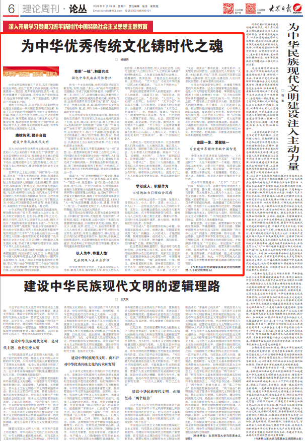 编者按:2013年11月,习近平总书记在曲阜发出大力弘扬中华优秀传统文化的号召,提出推动中华优秀传统文化创造性转化、创新性发展的重大方针。推动中华优秀传统文化保护传承,必须以观乎人文、洞察变幻的视野和高度,为中华优秀传统文化铸就时代之魂。大众日报理论周刊本期邀请山东大学儒学高等研究院特聘教授、孔子研究院原院长杨朝明深度解析中华优秀传统文化的丰富内涵与时代价值。