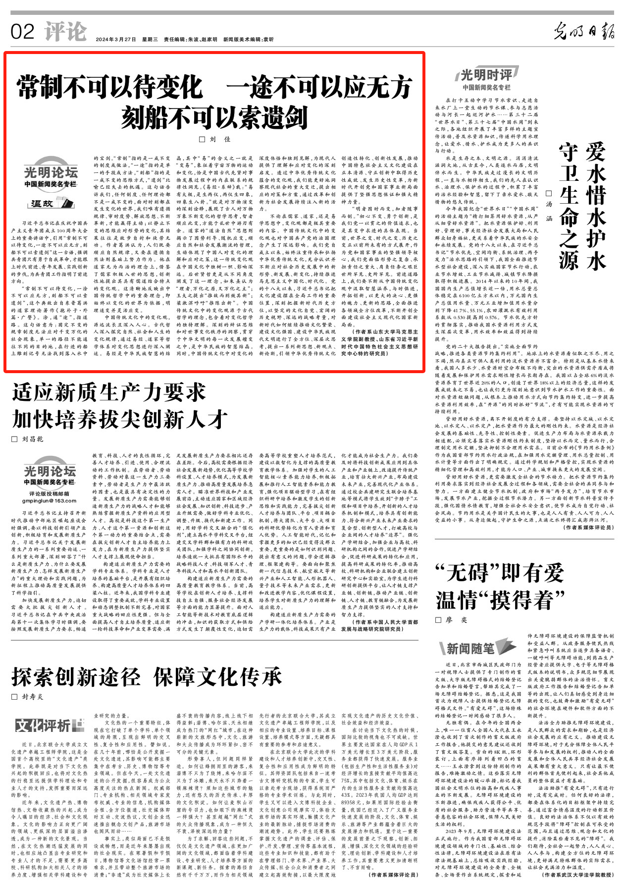 “常制不可以待变化,一涂不可以应无方,刻船不可以索遗剑”,这个典故出自东晋葛洪的道家理论著作《抱朴子·外篇·广譬》。涂,通“途”,指道路。这句话意为:固定不变的规章制度无法应对千变万化的社会现象,单一的路径不能通往不同的目的地,在行进的船上雕刻记号无法找到落入水中的宝剑。“常制”指的是一成不变的制度或做法,“一途”指的是单一的手段或方法,“刻船”指的是一成不变的思维方式,“遗剑”比喻已经失去的机遇。这句话告诉我们,任何制度、任何理论都不是一成不变的,面对时刻都在发生变化的世界,我们唯有遵循规律、审时度势、解放思想、不断革新,才能赢得主动;以静止不变的思维应对形势的变化,其结果往往是故步自封和徒劳无功。作者葛洪认为,人们既要顺应自然规律,又要在遵循自然法则基础上努力作为。他在道家无为而治的理念上,借鉴了儒家积极入世的思想,创新性地提出其具有儒道结合特点的变化观。这清晰地反映出中国传统哲学中的重要理念,即始终以变化的世界为依据,明理适变并灵活应变。