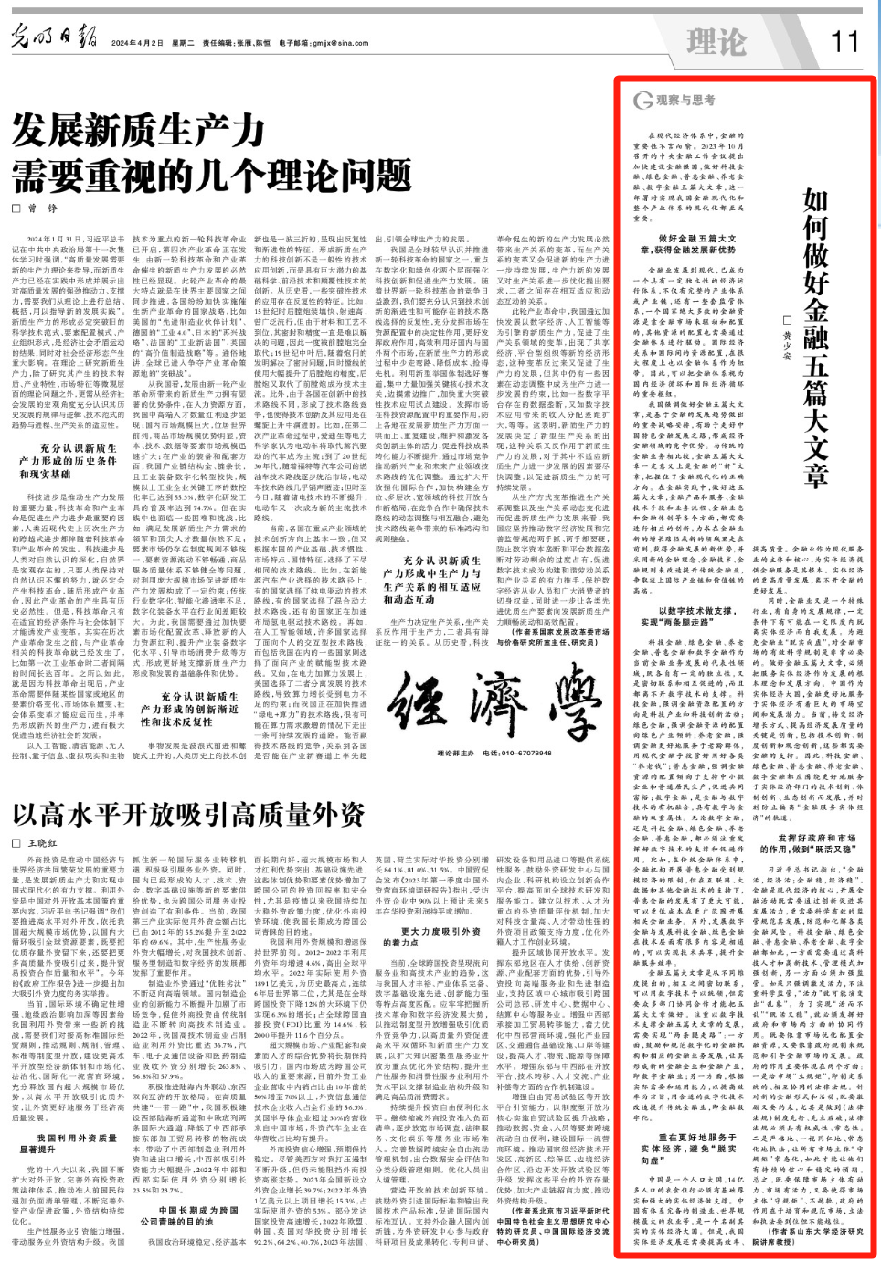 在现代经济体系中,金融的重要性不言而喻。2023年10月召开的中央金融工作会议提出加快建设金融强国,做好科技金融、绿色金融、普惠金融、养老金融、数字金融五篇大文章,这一部署对实现我国金融现代化和整个产业体系的现代化都至关重要。