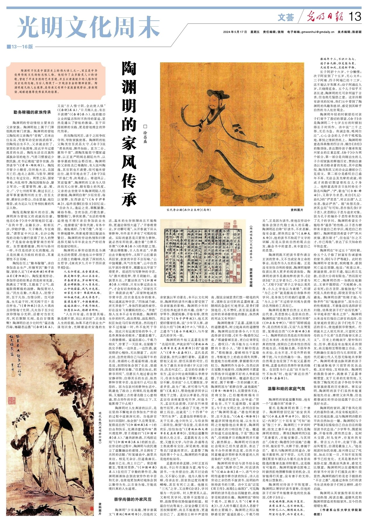 陶渊明从其家族传承而来的劳动热情、阅读志趣、道德风范和陶渊明营造的和睦家风,至今仍然熠熠生辉。